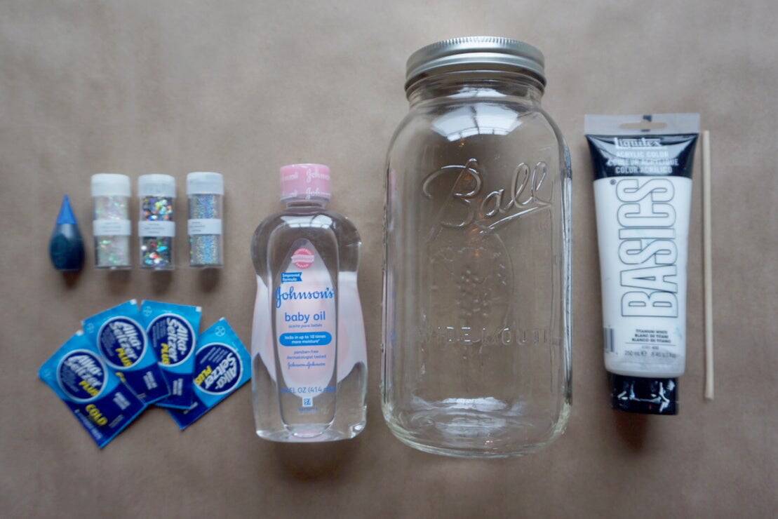1. Fill your jar about three-quarters full with baby oil. In a separate bowl, blend water and a few tablespoons of white paint.