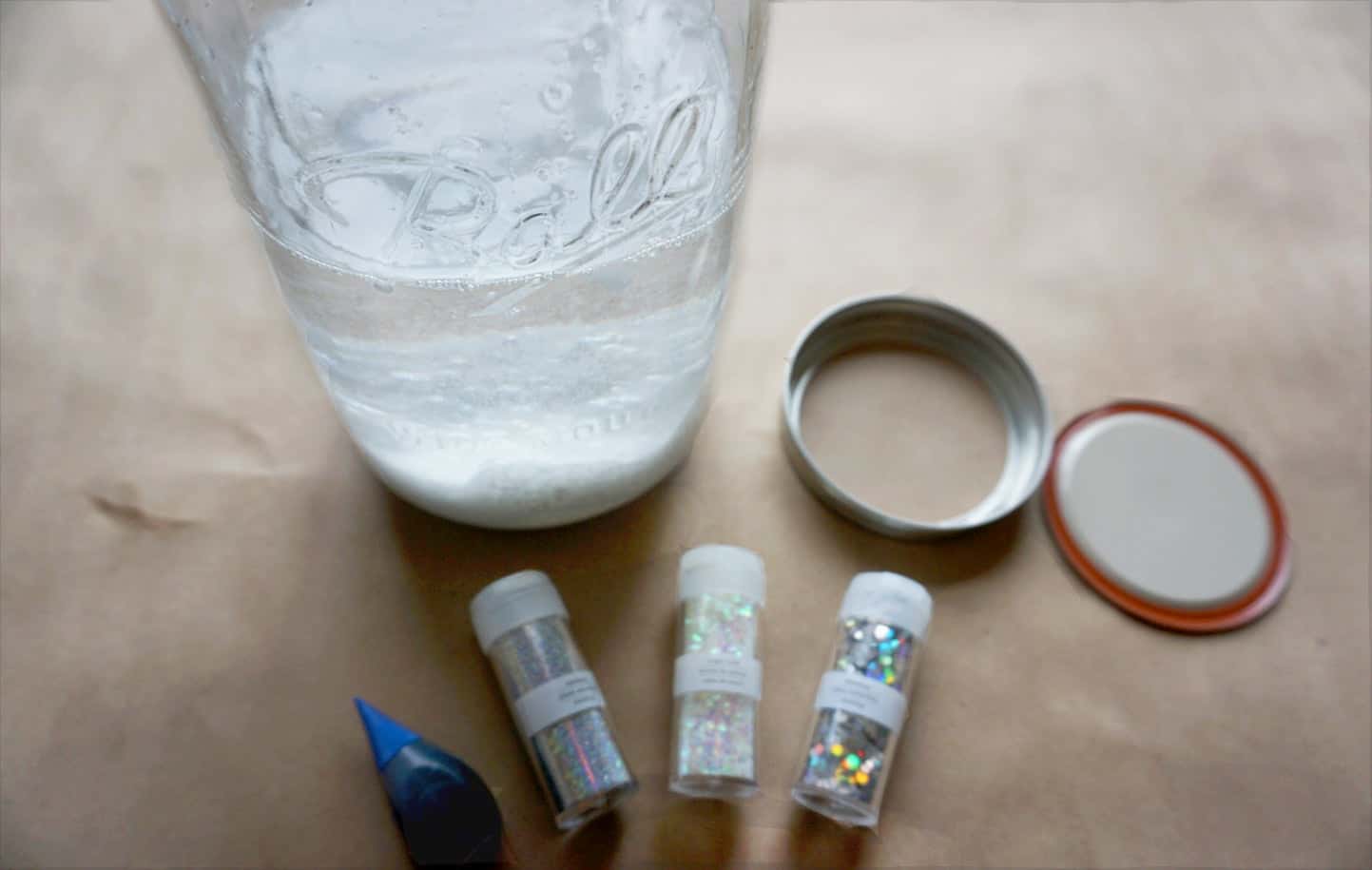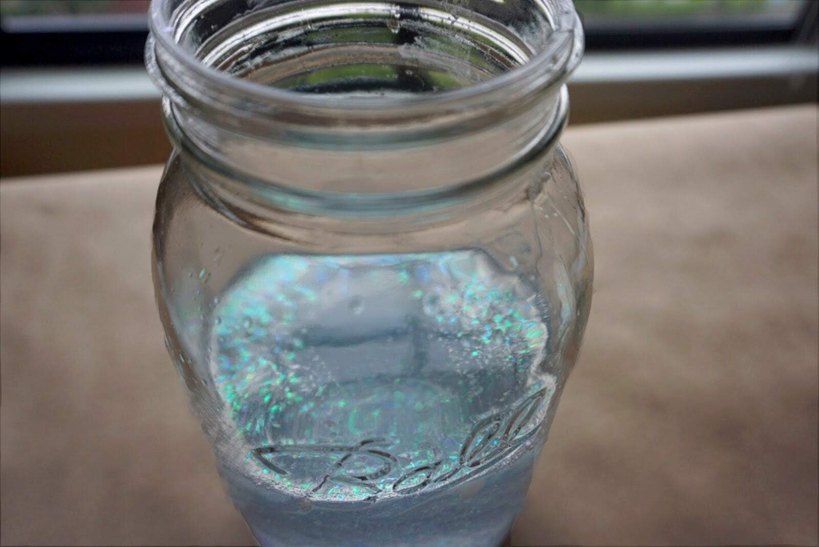2. Add as much glitter and blue food coloring to the oil as you’d like, and then top off the jar with your water and paint mixture.